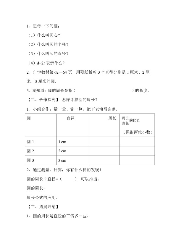 2、自学教材第62—64页,用硬纸板剪3个直径分别是1厘米、2厘米、3厘米的圆。