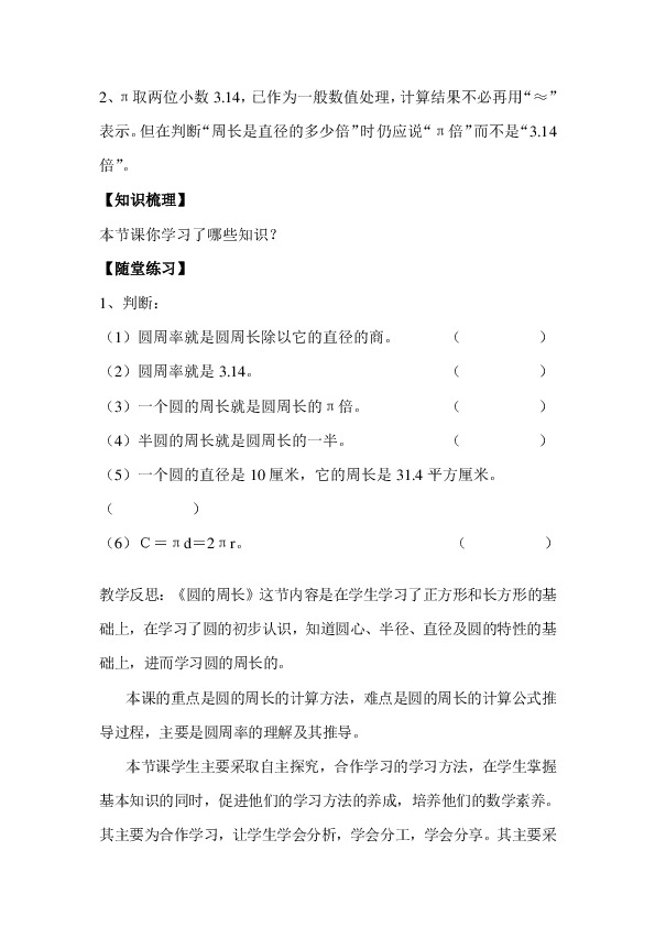教学反思:《圆的周长》这节内容是在学生学习了正方形和长方形的基础上,在学习了圆的初步认识,知道圆心、半径、直径及圆的特性的基础上,进而学习圆的周长的。