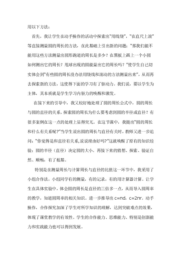 特别是在测量周长与计算周长与直径的比值这一环节中,我采用了小组合作法,小组同学有的测量,有的记录,有的用计算器计算。让学生在具体实验中,体会圆的周长是直径的三倍多一点,从而导入圆周率的教学,知道圆周率的相关知识。进一步推导出c=XXXXXd,c=2XXXXXr。动手操作,合作探究加深了学生对所学知识的理解,达到突破难点的效果,体现了课堂教学的有效性。学生的合作能力、思维能力、特别是创新能力和实践能力也可以得到发展。