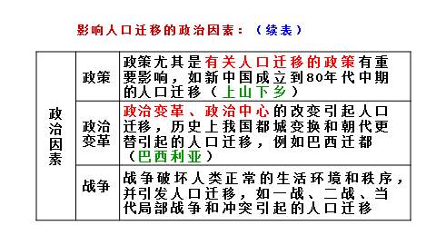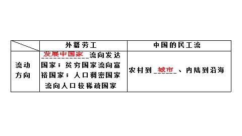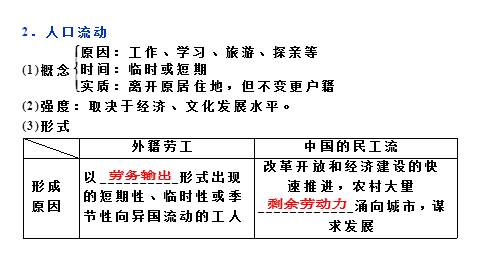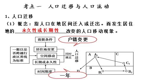 (1)概念:指人口在地区间迁入或迁出。而发生居住地的 改变的人口移动现象。