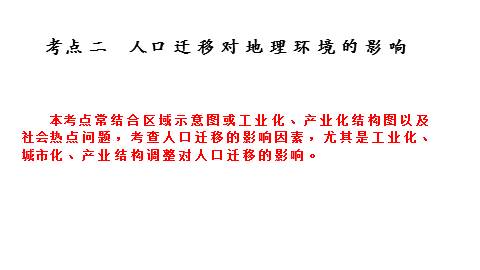 本考点常结合区域示意图或工业化、产业化结构图以及社会热点问题,考查人口迁移的影响因素,尤其是工业化、城市化、产业结构调整对人口迁移的影响。
