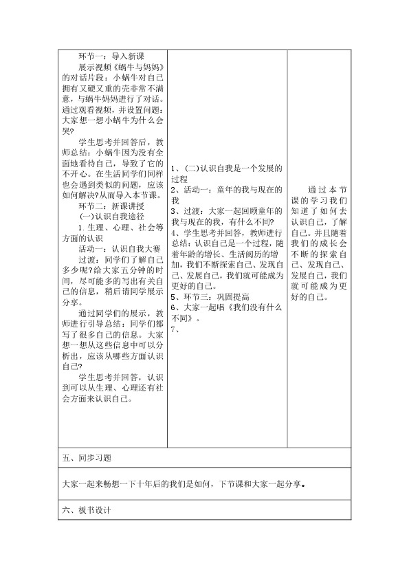 通过本节课的学习我们知道了如何去认识自己,了解自己。并且随着我们的成长会不断的探索自己、发现自己、发展自己,我们就可能成为更好的自己。