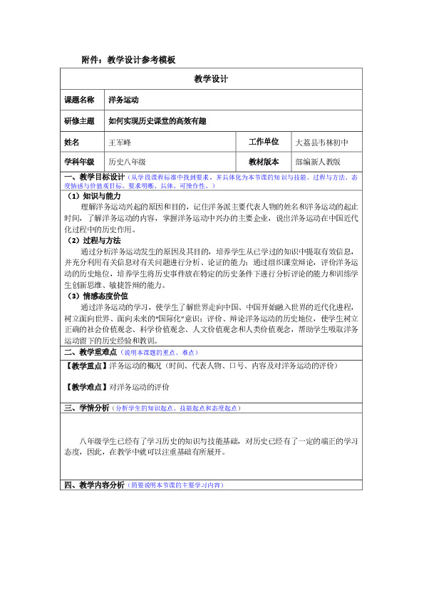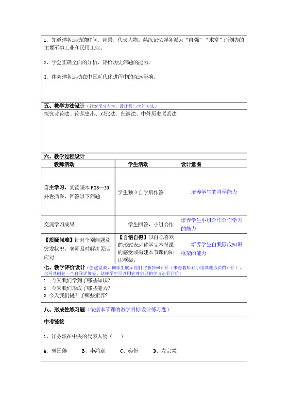 ??? 通过分析洋务运动发生的原因及其目的,培养学生从已学过的知识中提取有效信息,并充分利用有关信息对有关问题进行分析、论证的能力;通过组织课堂辩论,评价洋务运动的历史地位,培养学生将历史事件放在特定的历史条件下进行分析评论的能力和训练学生创新思维、敏捷答辩的能力。
