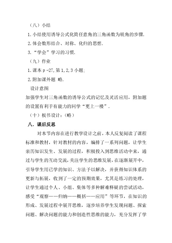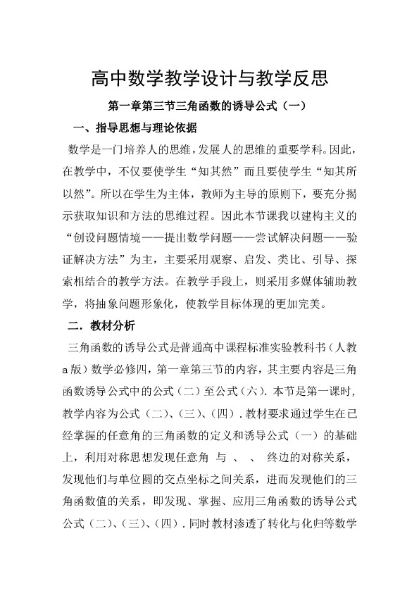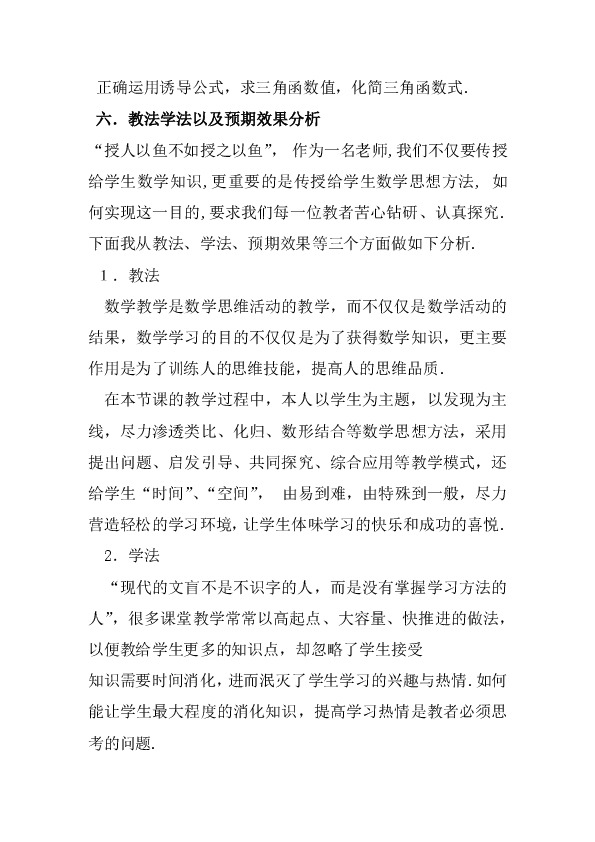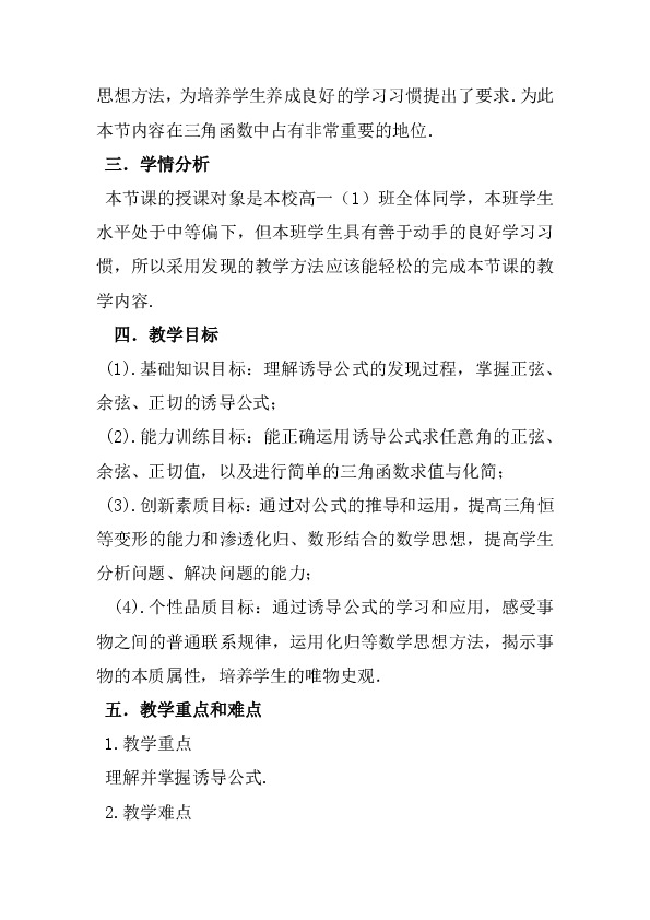 (4).个性品质目标:通过诱导公式的学习和应用,感受事物之间的普通联系规律,运用化归等数学思想方法,揭示事物的本质属性,培养学生的唯物史观.