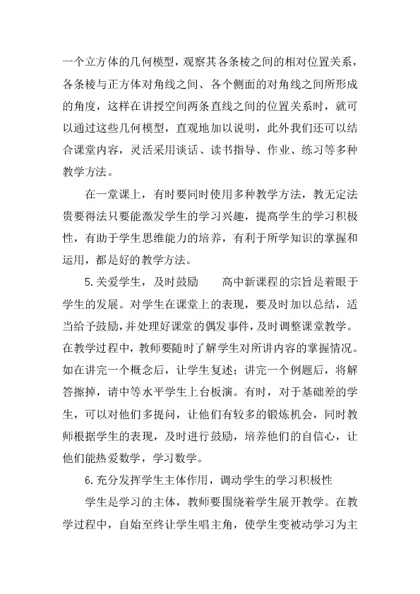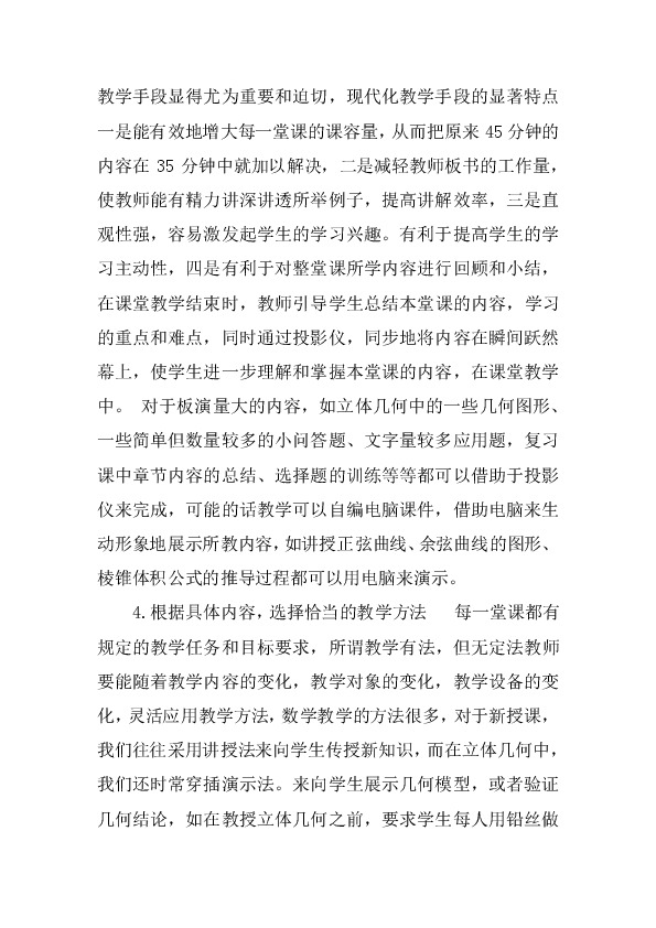 4.根据具体内容,选择恰当的教学方法 每一堂课都有规定的教学任务和目标要求,所谓教学有法,但无定法教师要能随着教学内容的变化,教学对象的变化,教学设备的变化,灵活应用教学方法,数学教学的方法很多,对于新授课,我们往往采用讲授法来向学生传授新知识,而在立体几何中,我们还时常穿插演示法。来向学生展示几何模型,或者验证几何结论,如在教授立体几何之前,要求学生每人用铅丝做一个立方体的几何模型,观察其各条棱之间的相对位置关系,各条棱与正方体对角线之间、各个侧面的对角线之间所形成的角度,这样在讲授空间两条直线之间的位置关系时,就可以通过这些几何模型,直观地加以说明,此外我们还可以结合课堂内容,灵活采用谈话、读书指导、作业、练习等多种教学方法。