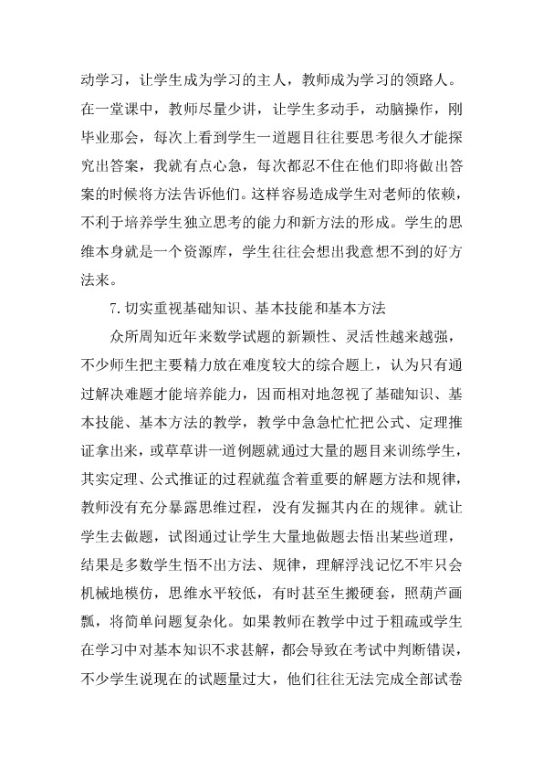众所周知近年来数学试题的新颖性、灵活性越来越强,不少师生把主要精力放在难度较大的综合题上,认为只有通过解决难题才能培养能力,因而相对地忽视了基础知识、基本技能、基本方法的教学,教学中急急忙忙把公式、定理推证拿出来,或草草讲一道例题就通过大量的题目来训练学生,其实定理、公式推证的过程就蕴含着重要的解题方法和规律,教师没有充分暴露思维过程,没有发掘其内在的规律。就让学生去做题,试图通过让学生大量地做题去悟出某些道理,结果是多数学生悟不出方法、规律,理解浮浅记忆不牢只会机械地模仿,思维水平较低,有时甚至生搬硬套,照葫芦画瓢,将简单问题复杂化。如果教师在教学中过于粗疏或学生在学习中对基本知识不求甚解,都会导致在考试中判断错误,不少学生说现在的试题量过大,他们往往无法完成全部试卷的解答,而解题速度的快慢主要取决于基本技能、基本方法的熟练程度及能力的高低,可见在切实重视基础知识的落实中同时应重视基本技能和基本方法的培养。