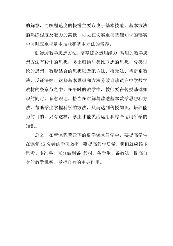 总之,在新课程背景下的数学课堂教学中,要提高学生在课堂45分钟的学习效率,要提高教学质量,我们就应该多思考、多准备,充分做到备 教材、备学生、备教法,提高自身的教学机智,发挥自身的主导作用。