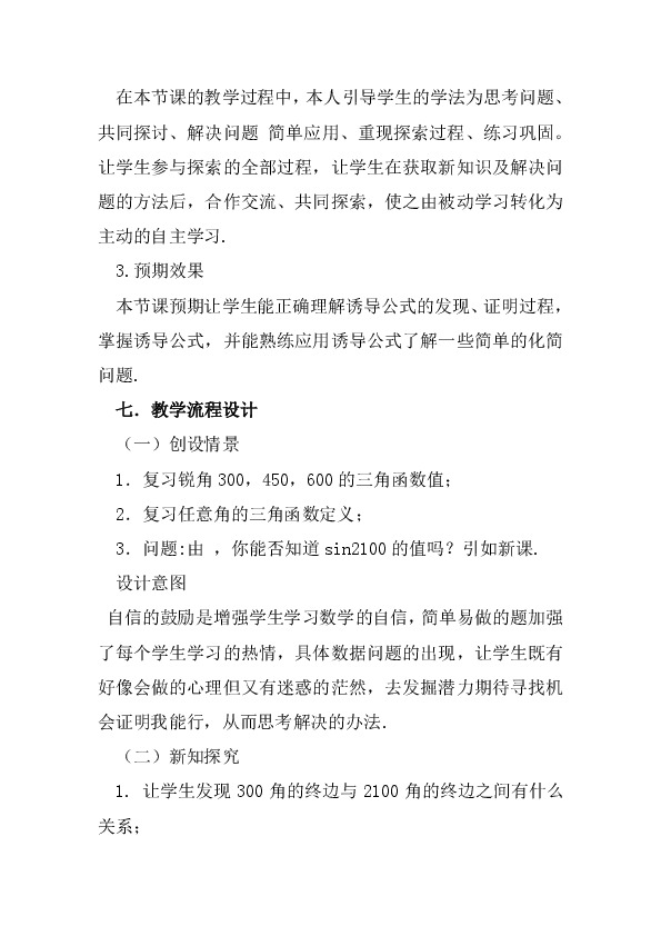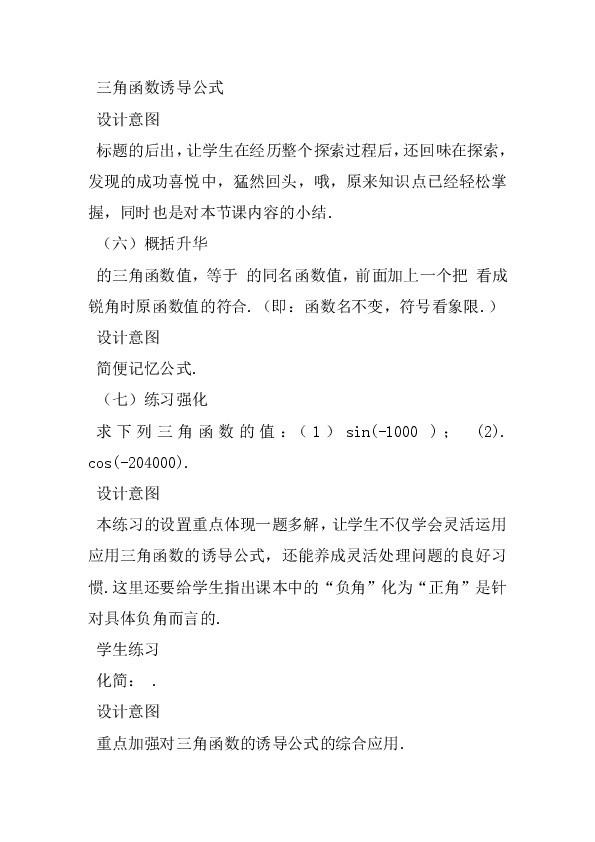 本节课预期让学生能正确理解诱导公式的发现、证明过程,掌握诱导公式,并能熟练应用诱导公式了解一些简单的化简问题.