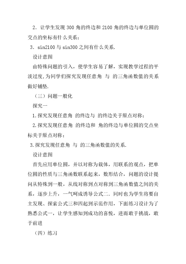 首先应用单位圆,并以对称为载体,用联系的观点,把单位圆的性质与三角函数联系起来,数形结合,问题的设计提问从特殊到一般,从线对称到点对称到三角函数值之间的关系,逐步上升,一气呵成诱导公式二.同时也为学生将要自主发现、探索公式三和四起到示范作用,下面练习设计为了熟悉公式一,让学生感知到成功的喜悦,进而敢于挑战,敢于前进