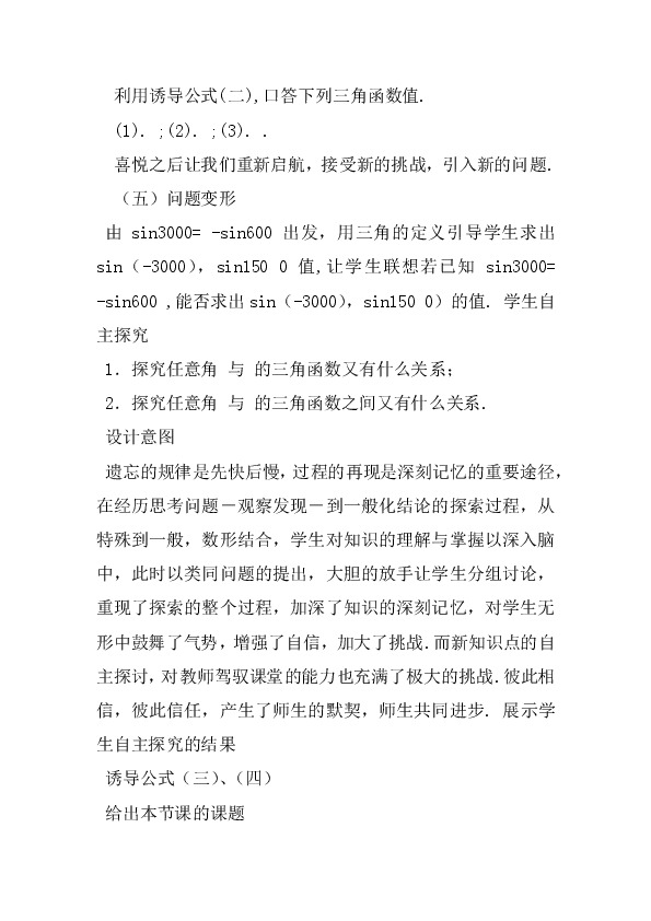 由sin3000= -sin600 出发,用三角的定义引导学生求出 sin(-3000),sin150 0值,让学生联想若已知sin3000= -sin600 ,能否求出sin(-3000),sin150 0)的值. 学生自主探究