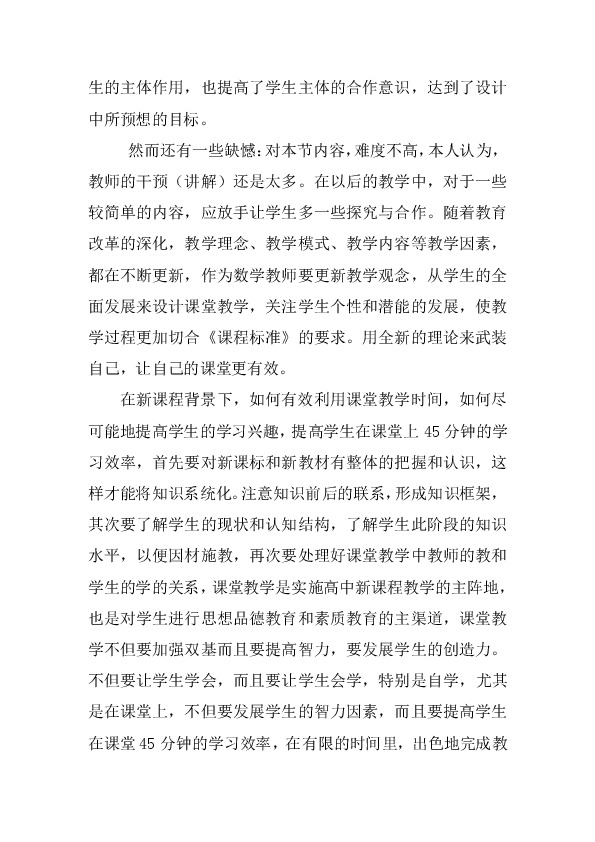 然而还有一些缺憾:对本节内容,难度不高,本人认为,教师的干预(讲解)还是太多。在以后的教学中,对于一些较简单的内容,应放手让学生多一些探究与合作。随着教育改革的深化,教学理念、教学模式、教学内容等教学因素,都在不断更新,作为数学教师要更新教学观念,从学生的全面发展来设计课堂教学,关注学生个性和潜能的发展,使教学过程更加切合《课程标准》的要求。用全新的理论来武装自己,让自己的课堂更有效。