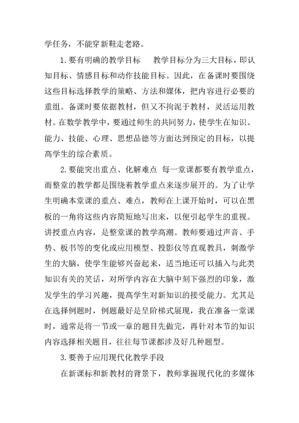 1.要有明确的教学目标 教学目标分为三大目标,即认知目标、情感目标和动作技能目标。因此,在备课时要围绕这些目标选择教学的策略、方法和媒体,把内容进行必要的重组。备课时要依据教材,但又不拘泥于教材,灵活运用教材。在数学教学中,要通过师生的共同努力,使学生在知识、能力、技能、心理、思想品德等方面达到预定的目标,以提高学生的综合素质。