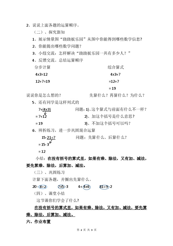 小结:在没有括号的算式里,如果有乘、除法,又有加、减法,要先算乘、除法,后算加、减法。