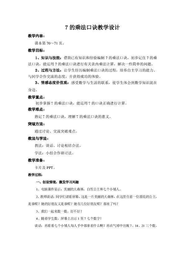以下为《7的乘法口诀教学设计》的无排版文字预览,完整格式请下载