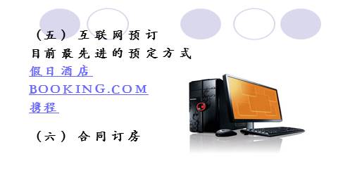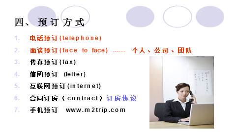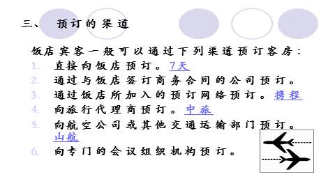 省时、省心、省力三、 预订的渠道饭店宾客一般可以通过下列渠道预订客房: