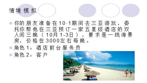 情境模拟你的朋友准备在10·1期间去三亚游玩,委托你帮他在三亚预订一家五星级酒店的双人间三晚(10月1-3日),要求是一线海景房,价格在3000左右每晚。