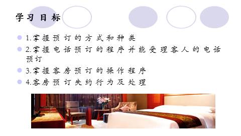 前厅客房预订服务 Room Reservation学习目标1.掌握预订的方式和种类