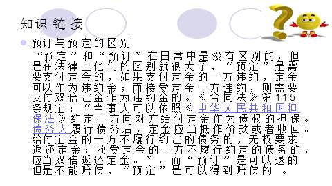 客房预订是指客人在抵店前要求饭店为其在某一时间段保留客房而履行的订约手续,又称订房。主题一 预订的方式和种类知识链接预订与预定的区别