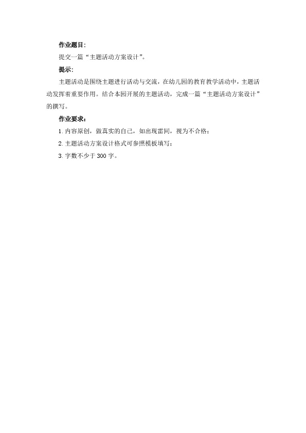 主题活动是围绕主题进行活动与交流,在幼儿园的教育教学活动中,主题活动发挥着重要作用。结合本园开展的主题活动,完成一篇“主题活动方案设计”的撰写。