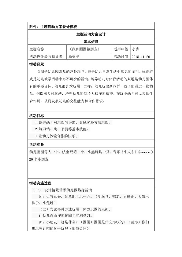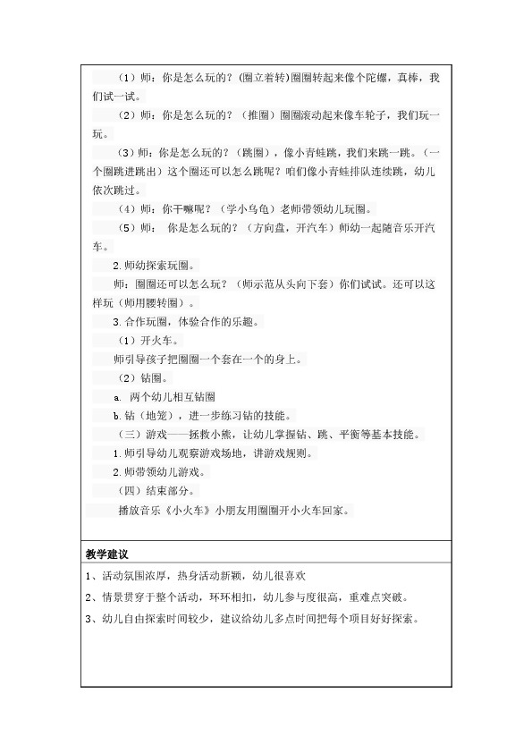 师:小朋友,这是什么?(圈圈)圈圈是什么形状的?(圆形)你们想玩吗?咱们玩一玩吧(播放音乐)