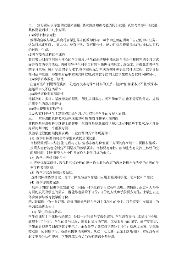 基础教育课程改革纲要(试行)? 和各学科的课程标准,对课程的实施.对教学过程和改进课堂教学的方方面面,都提出了一系列的要求。然而,这些要求都是原则性的和理想化的。到了具体的操作层面,教师普遍的感觉是无所适从。因此,从操作层面弄清“什么样的课力-是一堂好课”,这是学校教师最希望明确的问题。事实上,由于课程改革刚刚起步,我们确实很难一下子就明确无误地提出“—堂好课”的标准。再者,由于学科的差异.地区的差异.构成班级学生群体的差异和每一堂课教学内容的差异,“好课”的“个性”色彩非常突出。如果硬要用一个“标准”来衡量,本身就显得幼稚可笑。我校的教师.教研员和教育一线工作者对大量的、现实的课堂教学进行的剖析和研究,包括一些非常有价值的争论,对—堂好课的理性思考和一些非常有见地的理性概括,概括出新课程一堂好课的主要指标如下: