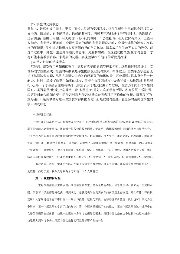 一堂好课要注重学生的表现,关注学生在课堂上是不是热情积极,快乐的学习,要立足于学生的发展,争取每个学生都得到收获,得到成功。也就是说学生实实在在的在课堂上有收获,那么有什么样的收获呢?大家知道教学有三维目标 知识与技能、过程与方法、情感态度和价值观。我们也可以细化为五个层次:第一个层次是他学到了新的知识;第二个层次是锻炼了他的能力;第三个层次是在这个过程中有良好的积极的情感体验,使他产生更进一步学习的强烈的要求;第四个层次是在这个过程中他越来越会主动地投入到学习中去;第五个层次是你的课堂能够影响他的一生。