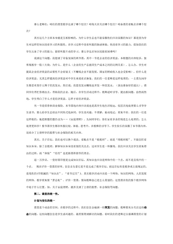 退一万步讲,一堂好课即便是完成知识目标,其知识也应该是网络中的一个点,而不是直线中的一个点。?现在评价一堂课的好坏,往往首先看它是不是完成了教学目标,而这目标却是教参或上级规定的,是线性的(即机械的“知识点”,“章节过关”)。其实教学活动应该是一个网络,知识的网络,人的发展的网络。教学效果要“算总帐”。评价一堂课,要问教师自己是怎么策划的,这堂课在他的整个教学网络中处于什么位置。如,关于家庭理财,就涉及到了上册的股票、社会保险等问题。