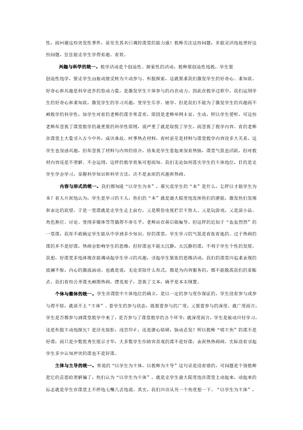 兴趣与科学的统一。教学活动是个创造性、探索性的活动,教师要创造性地教,学生要