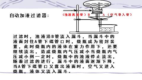 过滤时,浊液沿B管流入漏斗,当漏斗中的液面封住A管下端管某某,烧瓶成为密封装置,此时烧瓶内的液体在重力作用下,还要继续流出,造成烧瓶内气压减小当烧瓶内气压减小到一定时,烧瓶中的浊液停止流出,随着过滤的进行,漏斗中的液面逐渐下降,当A管下端管口又露出液面时,空气又进入烧瓶,液体又流入漏斗。