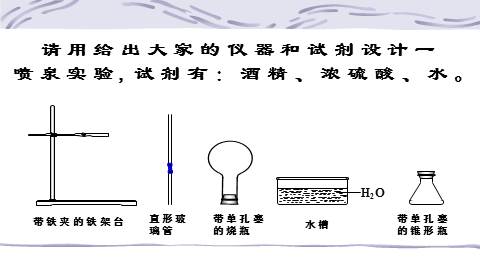 请用给出大家的仪器和试剂设计一喷泉实验,试剂有:酒精、浓硫酸、水。