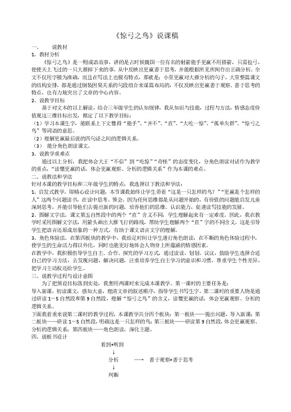 导入新课,初读课文,感知大意,理清文章的叙述顺序,指导学生书写生字。第二课时的重要人物是通过研读1-5自然段某某9自然段,理解“惊弓之鸟”的含义,读懂更羸的话,体会更羸观察、分析的逻辑关系。