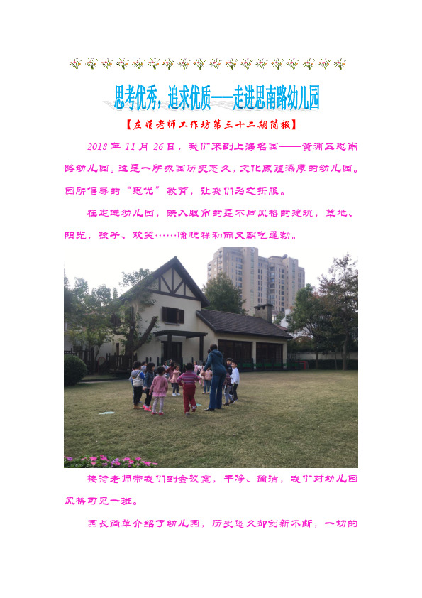 2018年11月26日,我们来到上海名园——***。这是一所办园历史悠久,文化底蕴深厚的幼儿园。园所倡导的“思优”教育,让我们为之折服。