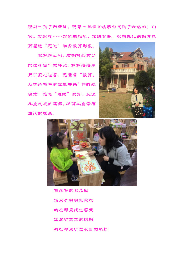 园长简单介绍了幼儿园,历史悠久却创新不断,一切的活动一孩子为主体,连每一栋楼的名字都是孩子命名的;白宫、芝麻楼XXXXXXXXXX形象而稚气,充满童趣,以精致化的保育教育塑造“思优”学前教育形象。