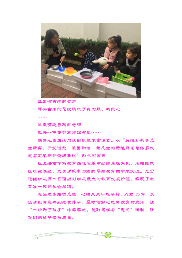 走出思南路幼儿园,心情久久不能平静,入职25年,从热情到倦怠再到思索升华,是时候静心思考教育的真谛,让“一切为了孩子”朴实落地;是时候学习“思优”精神,让我们的孩子幸福成长。