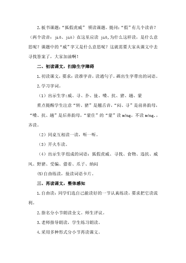 2.板书课题:“狐假虎威” 领读课题。提问:“假”有几个读音?(两个读音:jiXXXXX、jiXXXXX)在这里应读jiXXXXX,为什么这样读,是什么意思呢?课题中的“威”字又是什么意思呢?这就需要大家从课文中去寻找答案了,大家加油啊!