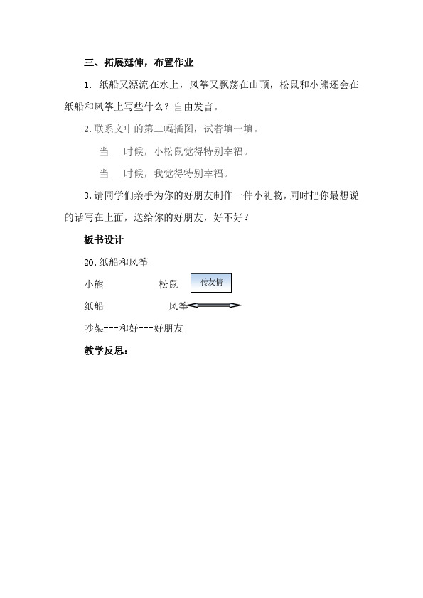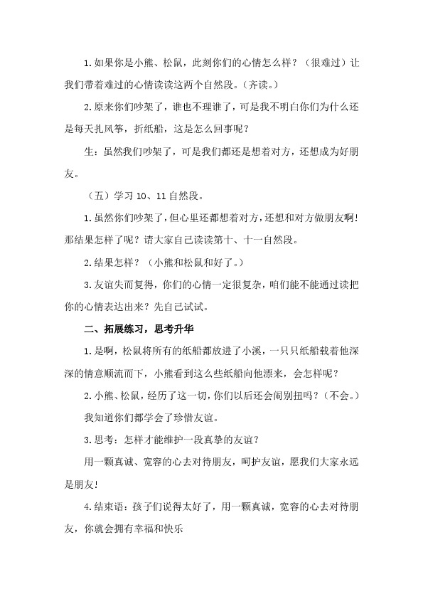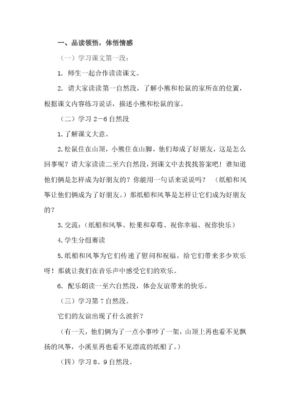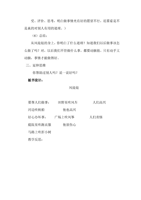 (6)总结: 从风娃娃的身上,你明白了什么道理?知道我们以后做事该怎么做了吗?对,以后我们不管做什么事,都要动脑筋。只有动手又动脑,事情才能做得好。 三、延伸思维 你帮助过别人吗?说一说好吗?