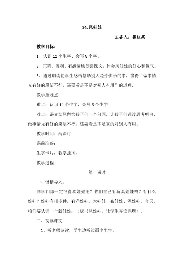 同学们都一定很喜欢娃娃吧?你们自己有玩具娃娃吗?有什么娃娃?娃娃有很多种,有洋娃娃、木娃娃、布娃娃、泥娃娃。今天,咱们要认识一个新娃娃:(板书风娃娃,让学生齐某某课题)。