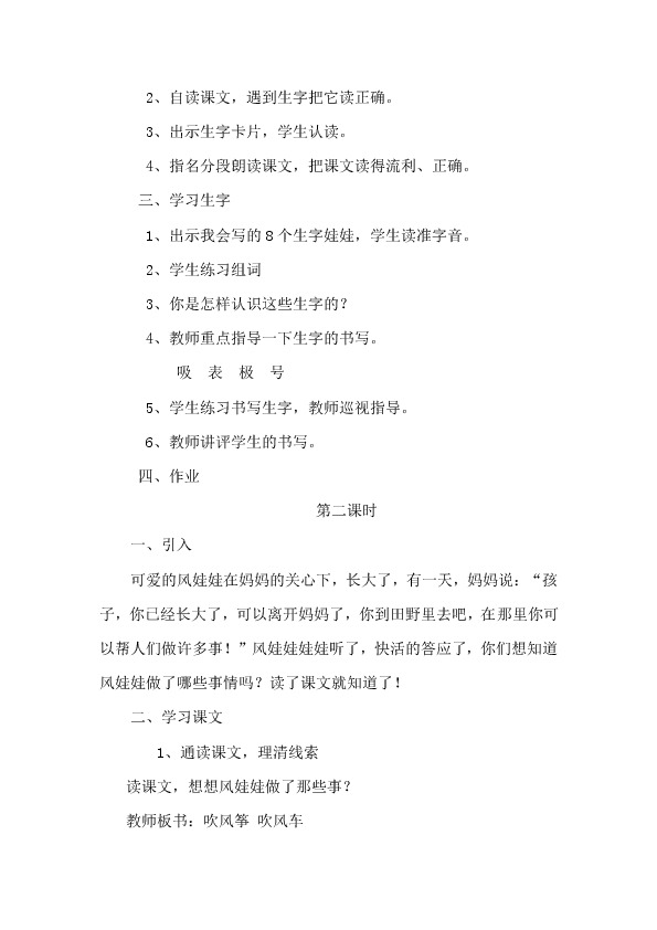 1、通读课文,理清线索读课文,想想风娃娃做了那些事? 教师板书:吹风筝 吹风车
