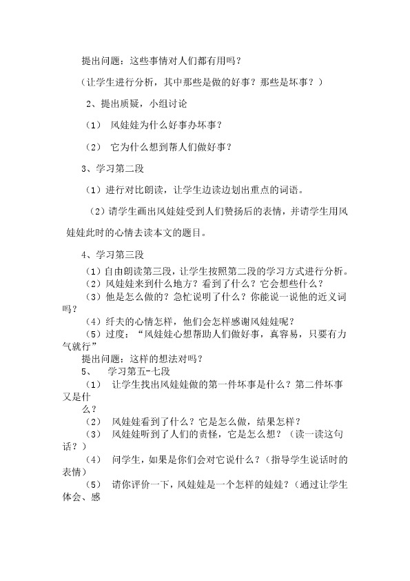 提出问题:这些事情对人们都有用吗? (让学生进行分析,其中那些是做的好事?那些是坏事?) 2、提出质疑,小组讨论 (1) 风娃娃为什么好事办坏事? (2) 它为什么想到帮人们做好事?