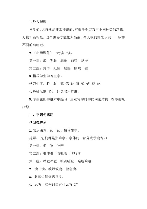 学习生字:狼 猩 鹤 鸽 羚 蚯 蚓 螃 蟹 蚕