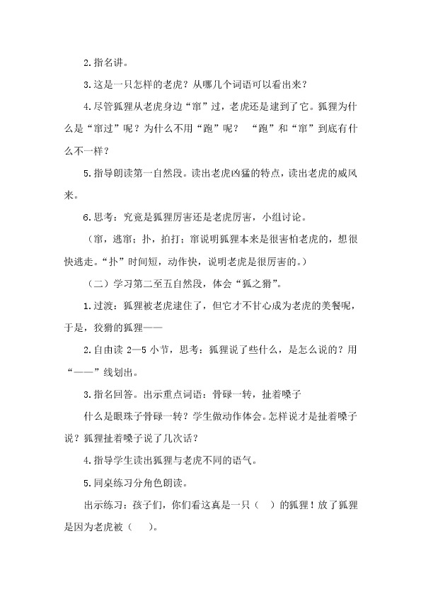 1.过渡:狐狸被老虎逮住了,但它才不甘心成为老虎的美餐呢,于是,狡猾的狐狸——