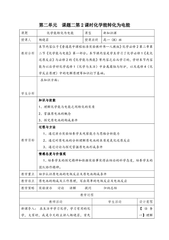 本节内容位于《普通高中课程标准实验教科书—人教版》化学必修2第二章某某二节《化学能与电能》第一部分。本节课内容是学生学习了化学必修1《氧化还原反应》与必修2的《化学能与热能》等内容之后而学习的,学好本节内容能为以后学好化学选修1(化学与生活)中金属腐蚀与防护,以及选修4(化学反应原理)中的电解原理等知识打下基础。