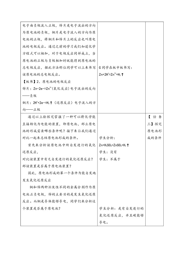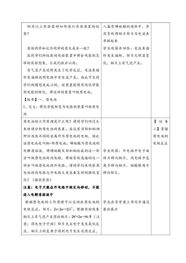 分析反应前后锌元素和氢元素的化合价由反应前零价和正一价分别变为正二价和零价,有化合价的变化,该反应的确属于氧化还原反应。如果能使该反应在发生氧化还原反应的同时电子做定向移动那么就会实现同学们的猜想——化学能能直接转化为电能,事实到底是不是这样呢,就让我们一起通过实验2-4来验证同学们的猜想。