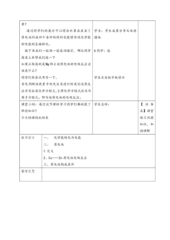 通过同学们的展示可以得出水果在具备了原电池形成四个条件的同时也能够实现化学能到电能的直接转化。