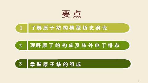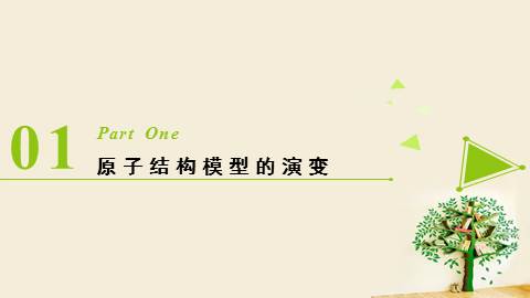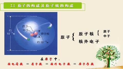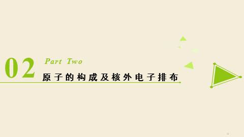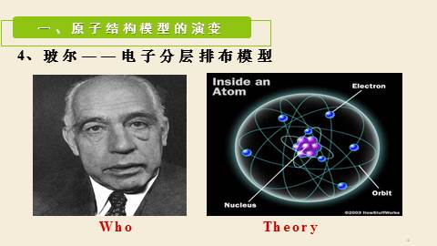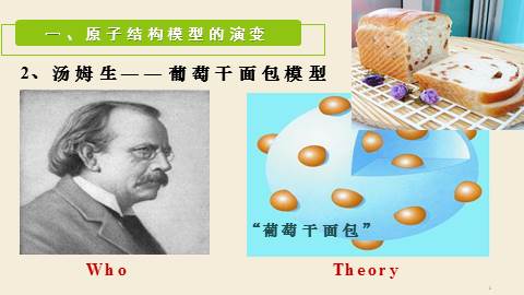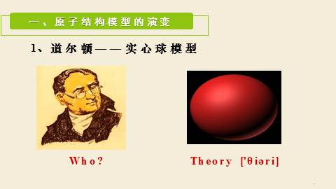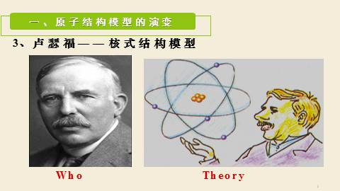 (德谟克利特)但实际上,存在的是原子(不可分割的意思)和空间。感觉上,存在的是缤纷的色彩,浓郁的芬芳, 深深的苦痛,01Part One原子结构模型的演变1、道尔顿——实心球模型一、原子结构模型的演变Who? Theory ['θi?ri] 2、汤某某——葡萄干面包模型“葡萄干面包”WhoTheory一、原子结构模型的演变3、卢某某——核式结构模型Who Theory一、原子结构模型的演变4、玻尔——电子分层排布模型 WhoTheory一、原子结构模型的演变Conclusion:原子结构模型的演变道尔顿:实心球模型汤某某:葡萄干面包模型卢某某:核式结构模型玻尔:电子分层排布20世纪初量子力学模型02Part Two原子的构成及核外电子排布2.1 原子的构成及原子核的构成在原子中: