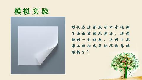 人类对原子结构的认识要点了解原子结构模型历史演变理解原子的构成及核外电子排布12掌握原子核的组成3模拟实验你认为这张纸可以永远撕下去而变的无穷小,还是撕到一定程度,达到了其最小的组成后就不能再继续撕了? 公元前5世纪,古希腊哲学家德谟克利特提出: