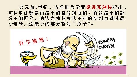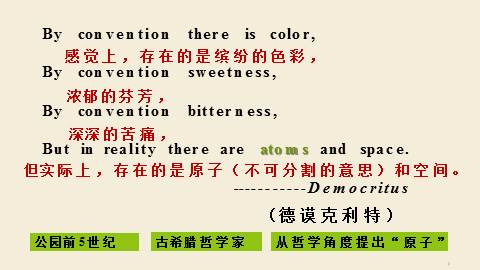 每样东西都是由最小的部分组成的,而这最小的部分不能再分。他认为物体可以不断的切割直到其最小部分,这最小的部分称为“原子”。哲学臆测!公园前5世纪古希腊哲学家从哲学角度提出“原子”By convention there is color,