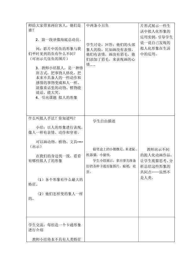 3.过程与方法:学生学习把日常物品、动、植物等画出来后添加五官、手脚及衣服,掌握拟人化的绘画方法。