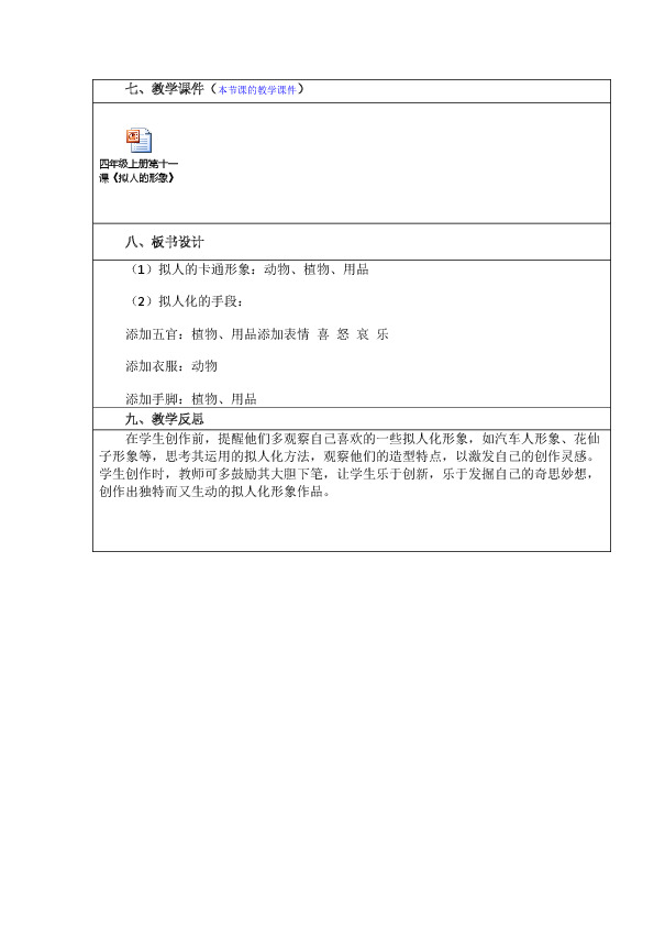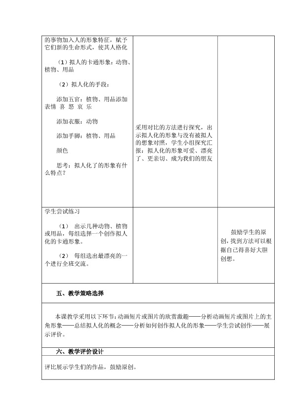 本课教学采用以下环节:动画短片或图片的欣赏激趣──分析动画短片或图片上的主角形象──总结拟人化的概念──分析如何创作拟人化的形象──学生尝试创作──展示评价。