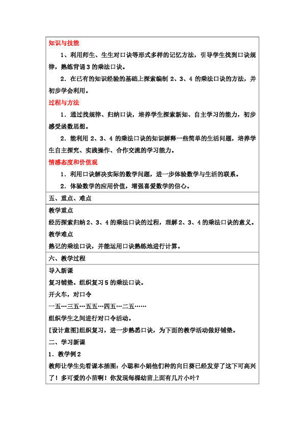 经历探索归纳2、3、4的乘法口诀的过程,理解2、3、4的乘法口诀的意义。